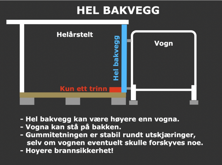 | Dersom lokale regler hindrer hel bakvegg, har vi en alternativ løsning. a) Store utskjæringer i bakvegg, likevel stabil bæring og god gummitetning som ved vanlig hel bakvegg. b) Hel bakvegg kan være høyre enn vogna. c) Vogna kan stå på bakken. d) Kun ett trinn mellom helårstelt og vogn. e) Gummitetning er stabil selv om vogna evt. skulle forskyves noe. |