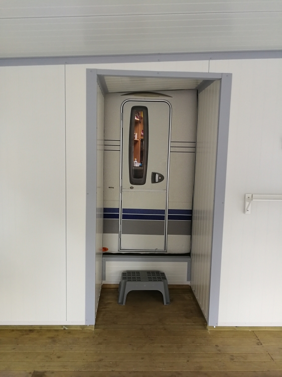 | Bakvegg mot campingvogn kan, om ønskelig, fås i full høyde. Prisen inkluderer: Utskjæring av åpninger for dør, toalett-luke og strømuttak etter behov. Solid gummitetning mellom helårstelt og vogn rundt toalettlukens åpning, samt ekstra dør. a) Hel bakvegg kan være høyere enn vogna. b) Vogna kan stå på bakken. c) Kun ett trinn mellom helårstelt og vogn. d) Gummitetning er stabil selv om vogna evt. skulle forskyves noe. |