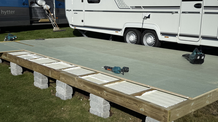 Gulv i helårstelt har vannfaste sponplater. For å sikre lang levetid og kvalitet bruker vi fundamenter av betong under platting og terasse.