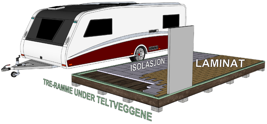 - Ønsker isolert gulv (med eller uten varmefolie), men eksisterende platting er større enn valgte mål for ScandiCamp helårstelt. I slike tilfeller monterer ScandiCamp en ny platting over den eksisterende, med fastmontert isolasjon i ramme under vannfaste sponplater.
