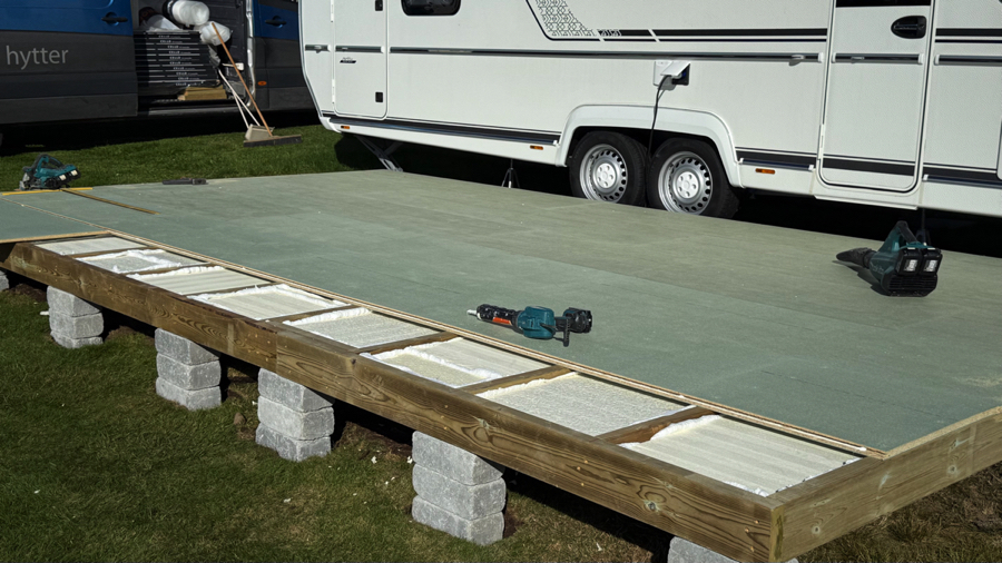 Som den beste og mest langsiktige løsningen anbefaler ScandiCamp å demontere eksisterende platting og bygge en helt ny platting, tilpasset helårstelt og vogn.