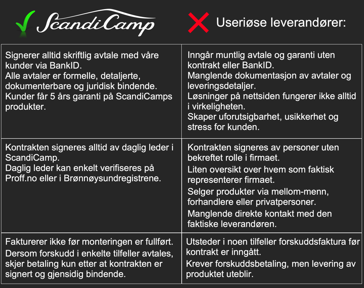 ScandiCamp har sett behovet for denne informasjonen om trygg handel etter at mange, gjennom flere år, har kontaktet oss for å få råd. Kunder fra konkurrerende leverandører har opplevd å betale forskudd, men at det bestilte produktet likevel ikke har blitt levert.